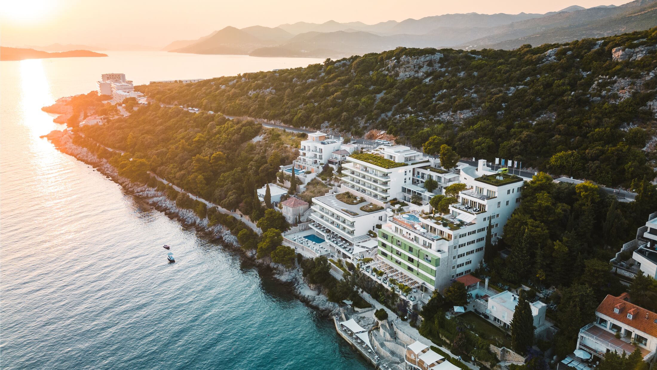 Hotel More is located on the Lapad Peninsula, a peaceful area just 3.5km from Dubrovnik’s Old Town. Surrounded by pine forests and overlooking the Adriatic Sea, the hotel offers easy access to walking trails, local restaurants, and beaches. Transfer time from Dubrovnik Airport is approximately 30 minutes.