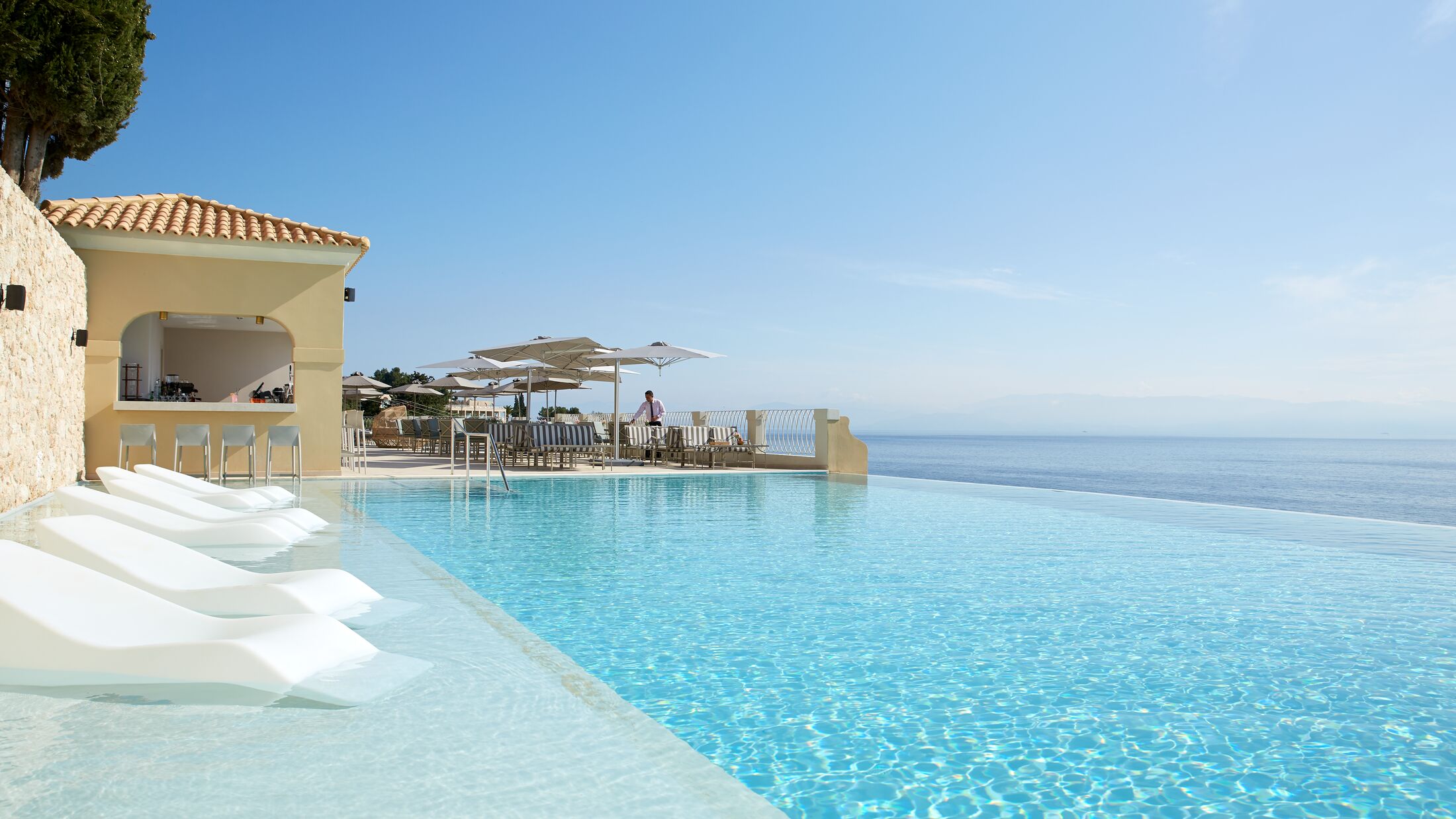 The exclusive adults-only Nido, Mar-Bella Collection resort is happily situated on the peaceful southern part of the east coast of Corfu, with views across sparkling, crystalline waters to mainland Greece. The hotel itself is nestled amid lush, fragrant gardens, with fresh, elegant interiors that quietly speak of luxury and good taste.