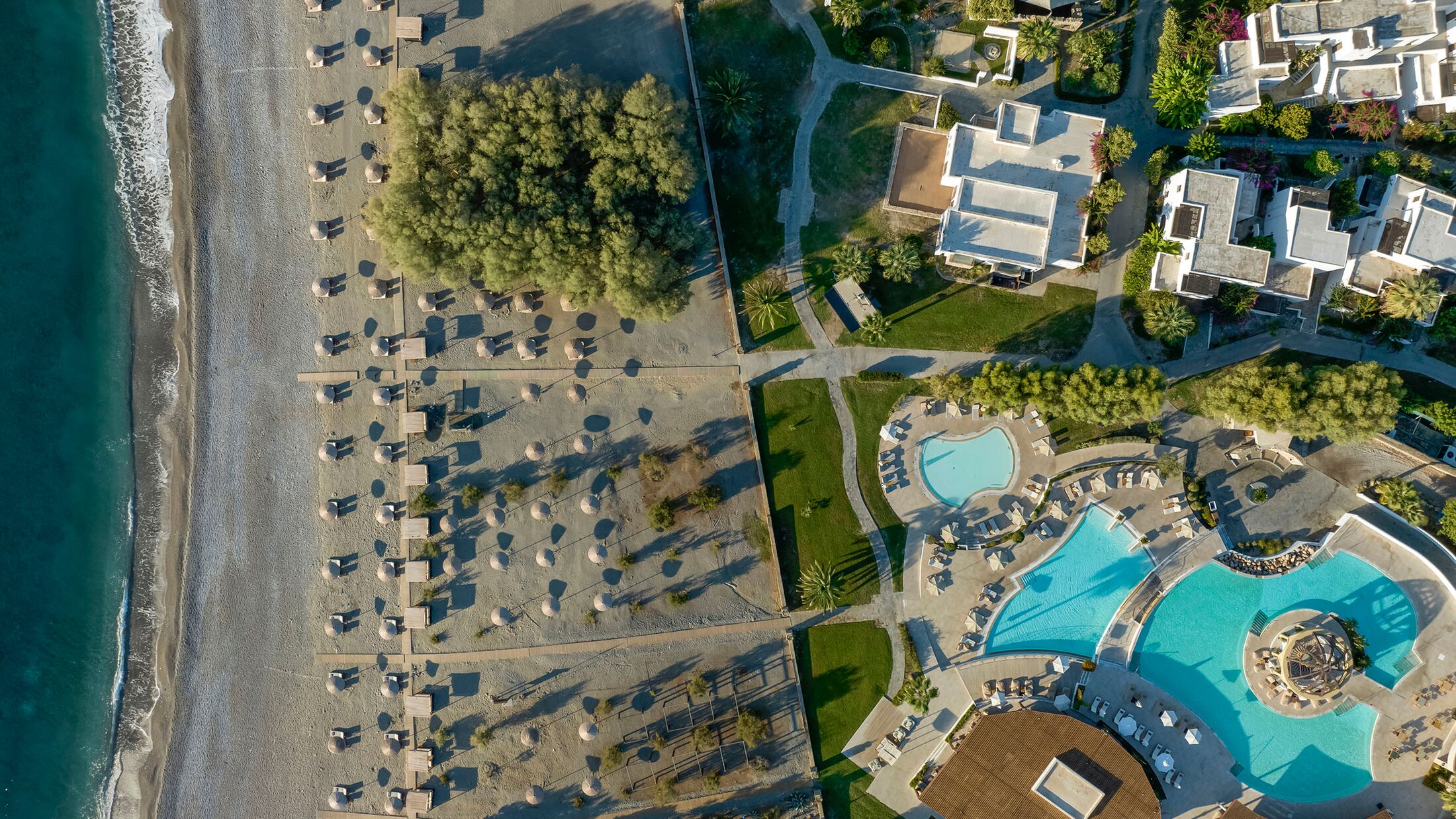 A secluded stretch of Lardos Beach with sunbeds, umbrellas and direct access to the Aegean. Guests can enjoy beachside Grab-and-Go dining and drinks service throughout the day.