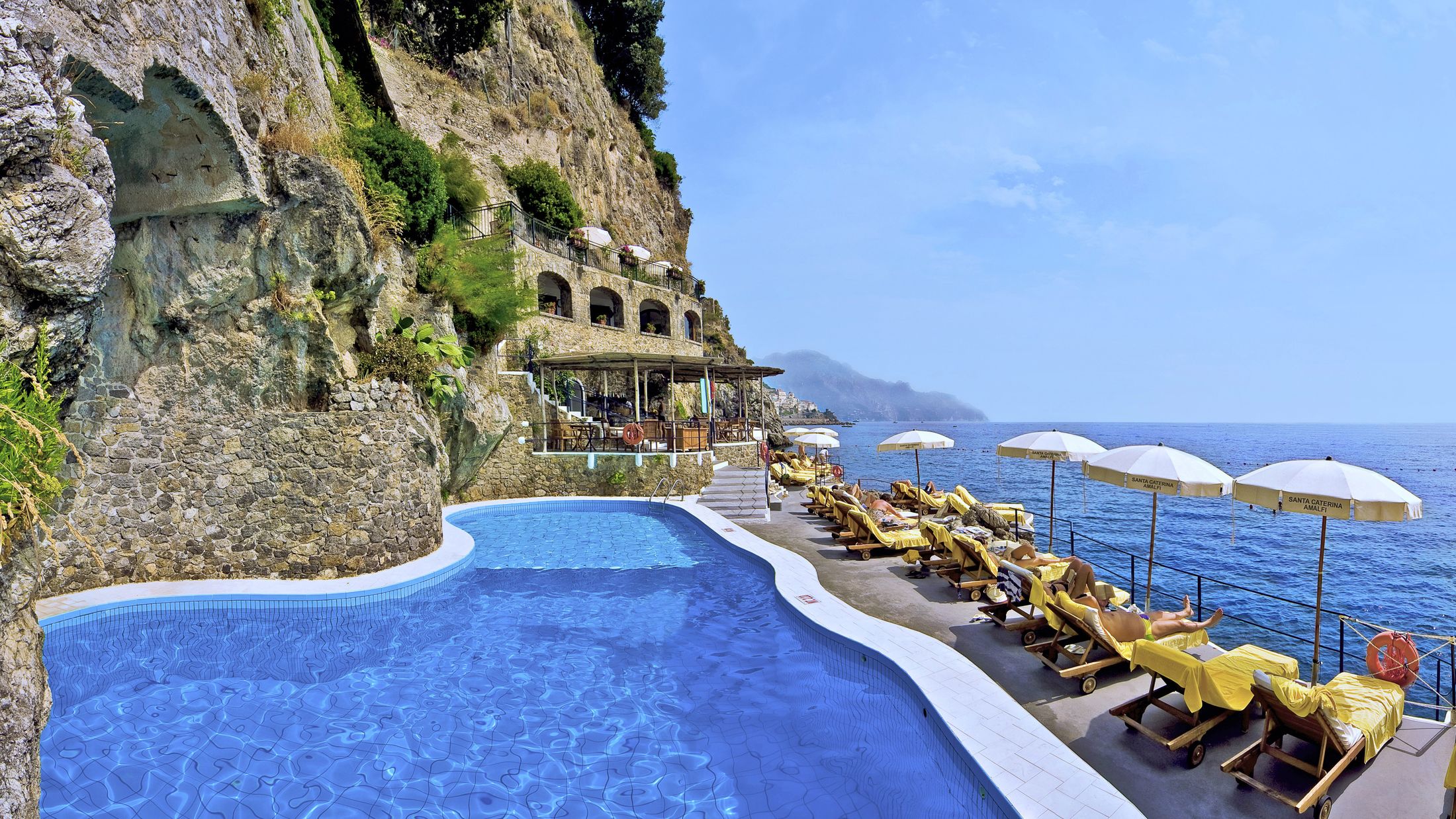 Perched on the rugged cliffside of the spectacular Amalfi coast, Hotel Santa Caterina is a statuesque and grand Italian villa, and the very essence of luxurious, elegant travel. Built in the early 19th Century, the beautiful building gazes down at the historic marina set in the pristine, turquoise blue waters of the Mediterranean Sea.