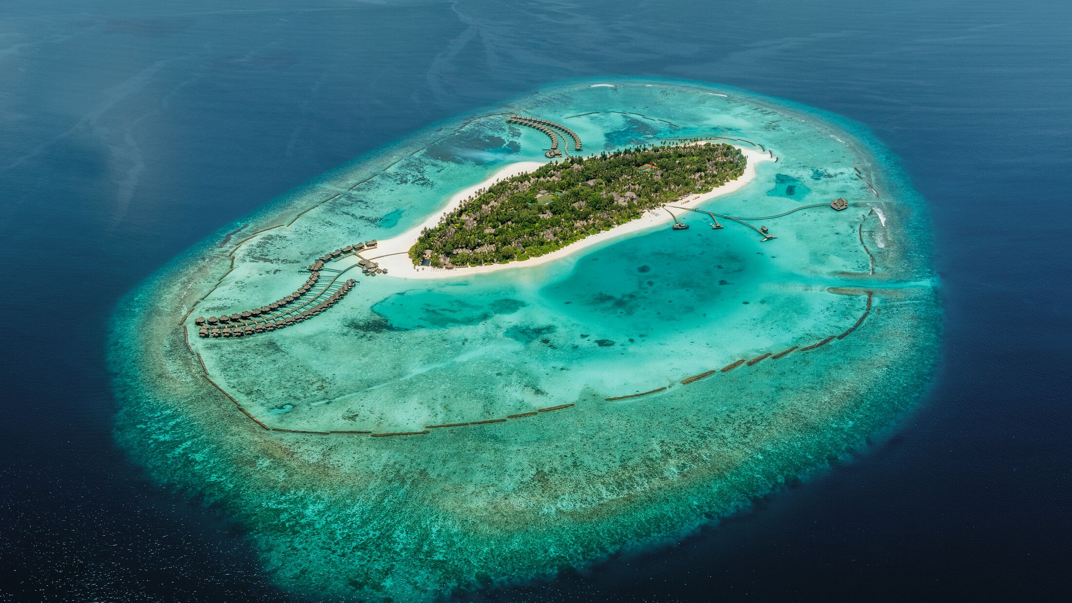 The resort features two main pools: Fluid, a family-friendly pool with shaded loungers and a swim-up bar, and Reflections, an adults-only pool with serene views and cocktail service. The beach wraps around the island with powder-white sand and azure waters, perfect for snorkeling and sunbathing.